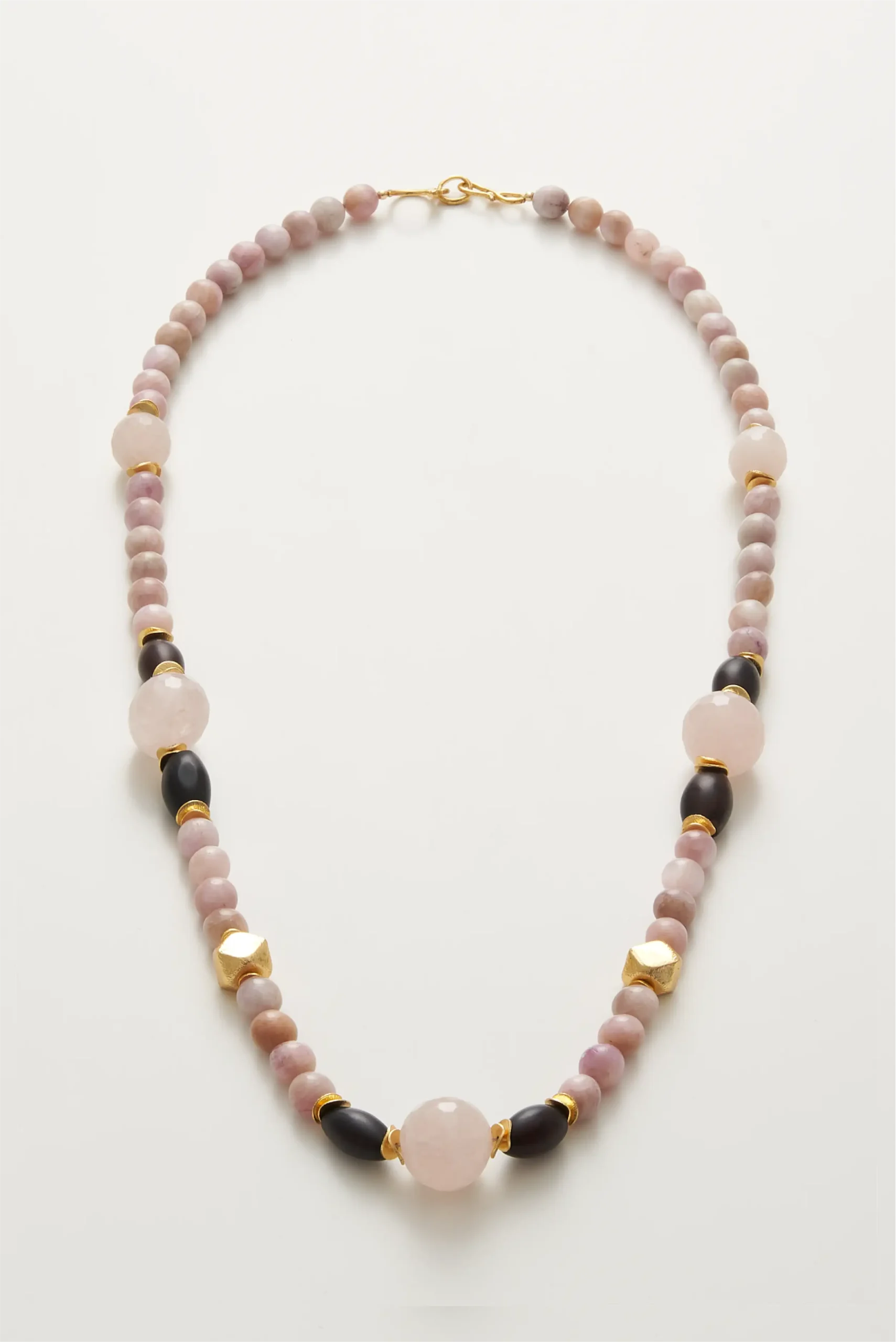 Pink Quartz ve Kunzit doğal taşlarından üretilmiştir. Klips ve diğer materyaller, bronz üzerine altın kaplamadır.