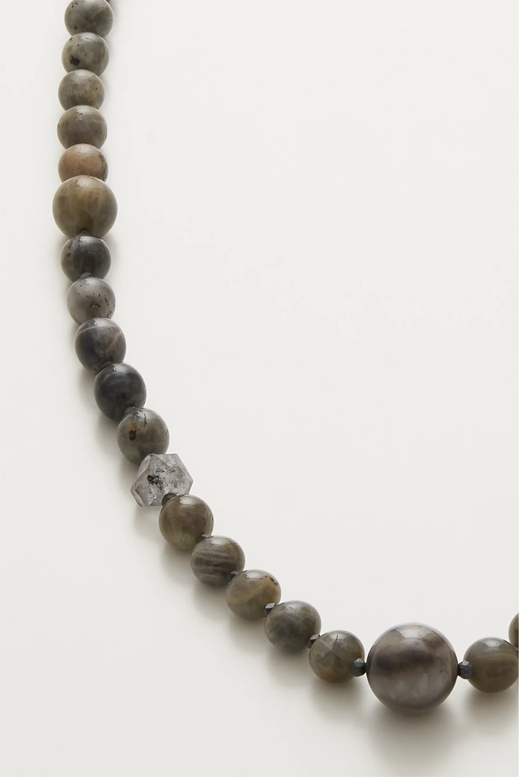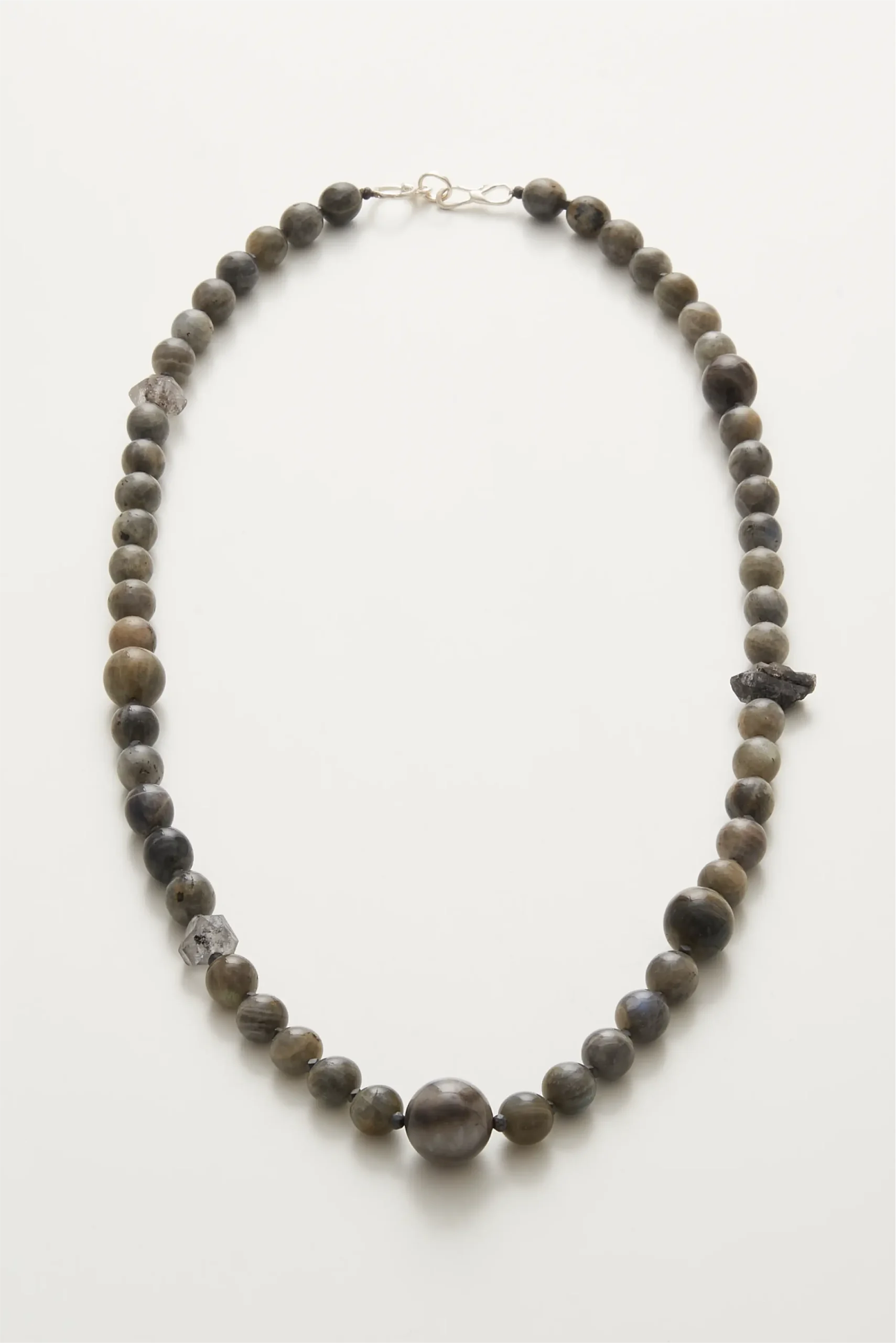Labradorit ve Smokey Quartz doğal taşlarından üretilmiştir. Klips ve diğer materyaller, bronz üzerine gümüş kaplamadır.