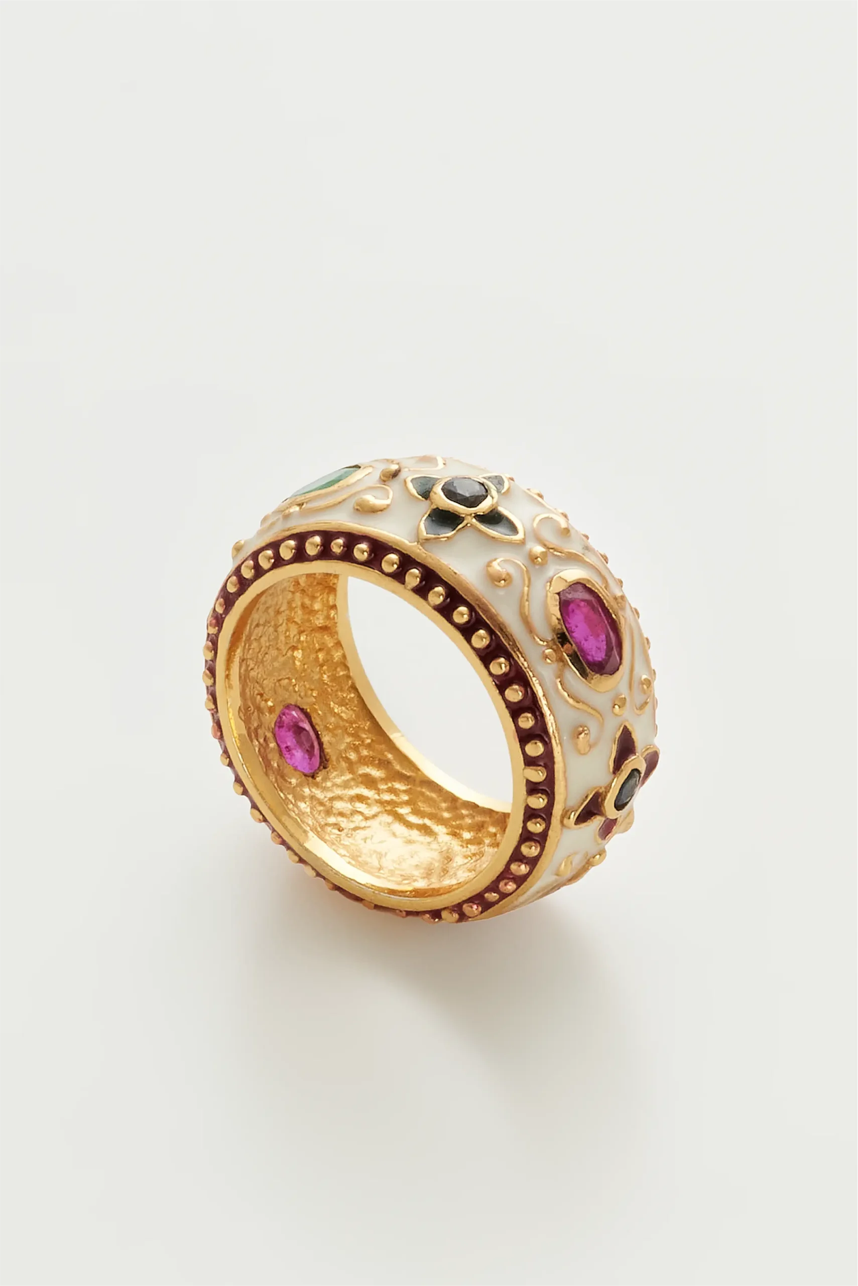 925 ayar gümüş üzerine 22 ayar 3 mikron altın kaplama, mine (enamel) ve özenle seçilmiş doğal taşlarla üretilmiştir.