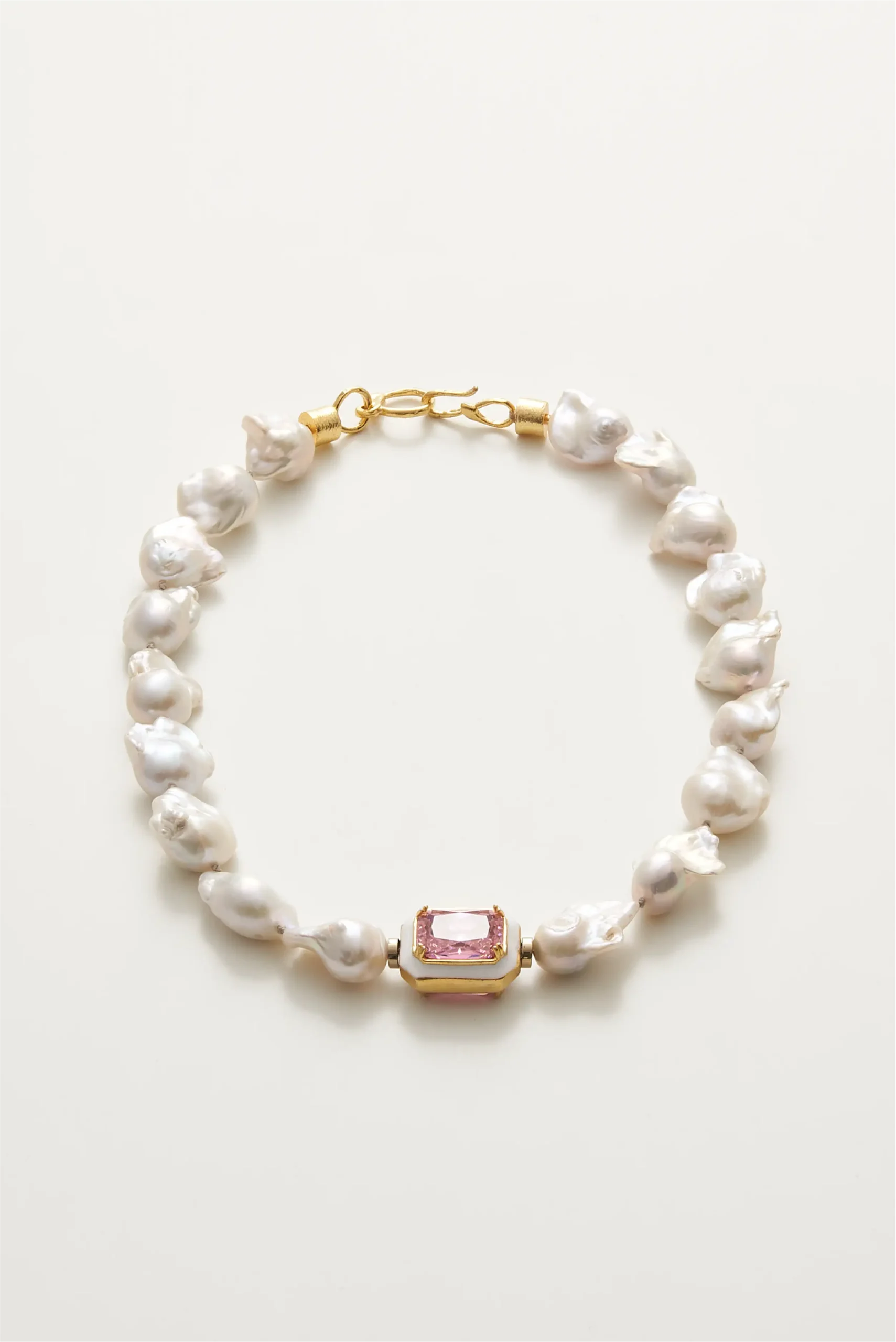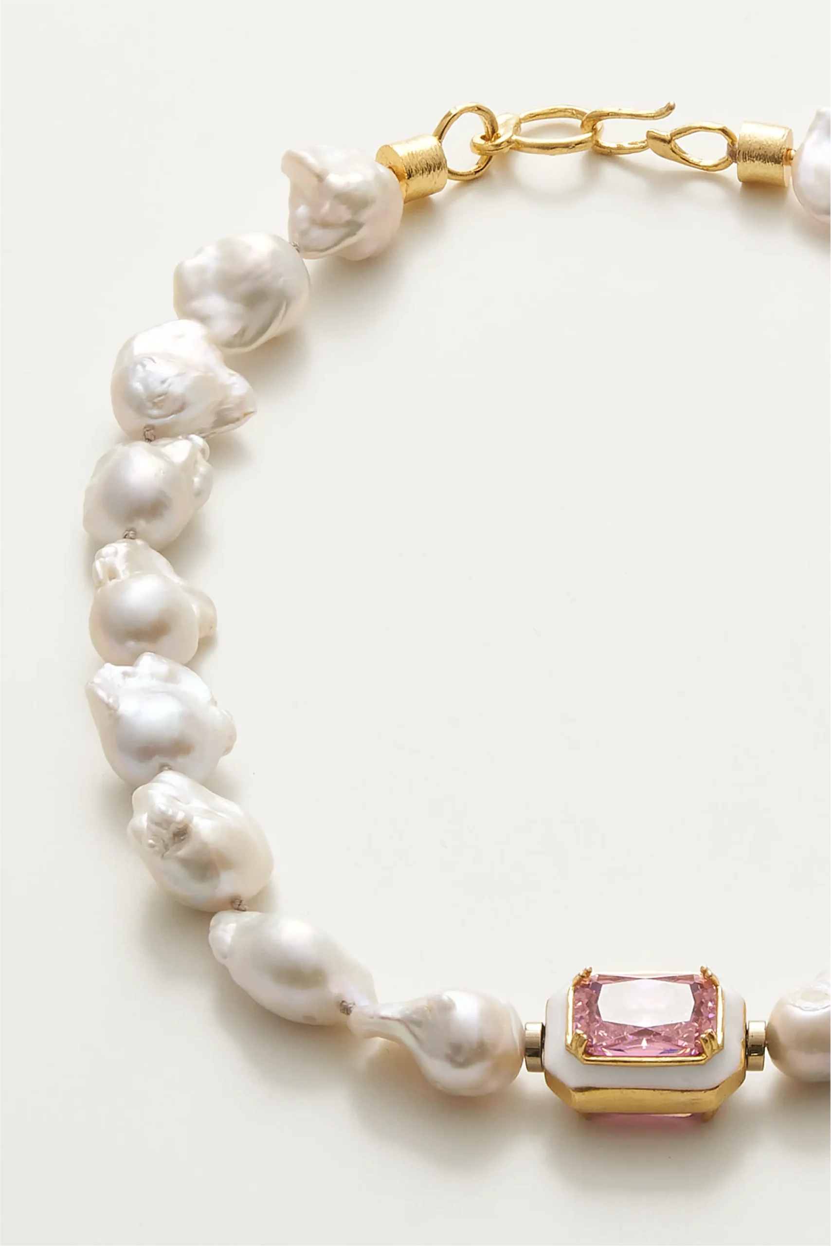 Barok İnci ve pembe Quartz doğal taşlarından üretilmiştir. Klips ve diğer materyaller, bronz üzerine altın kaplamadır.