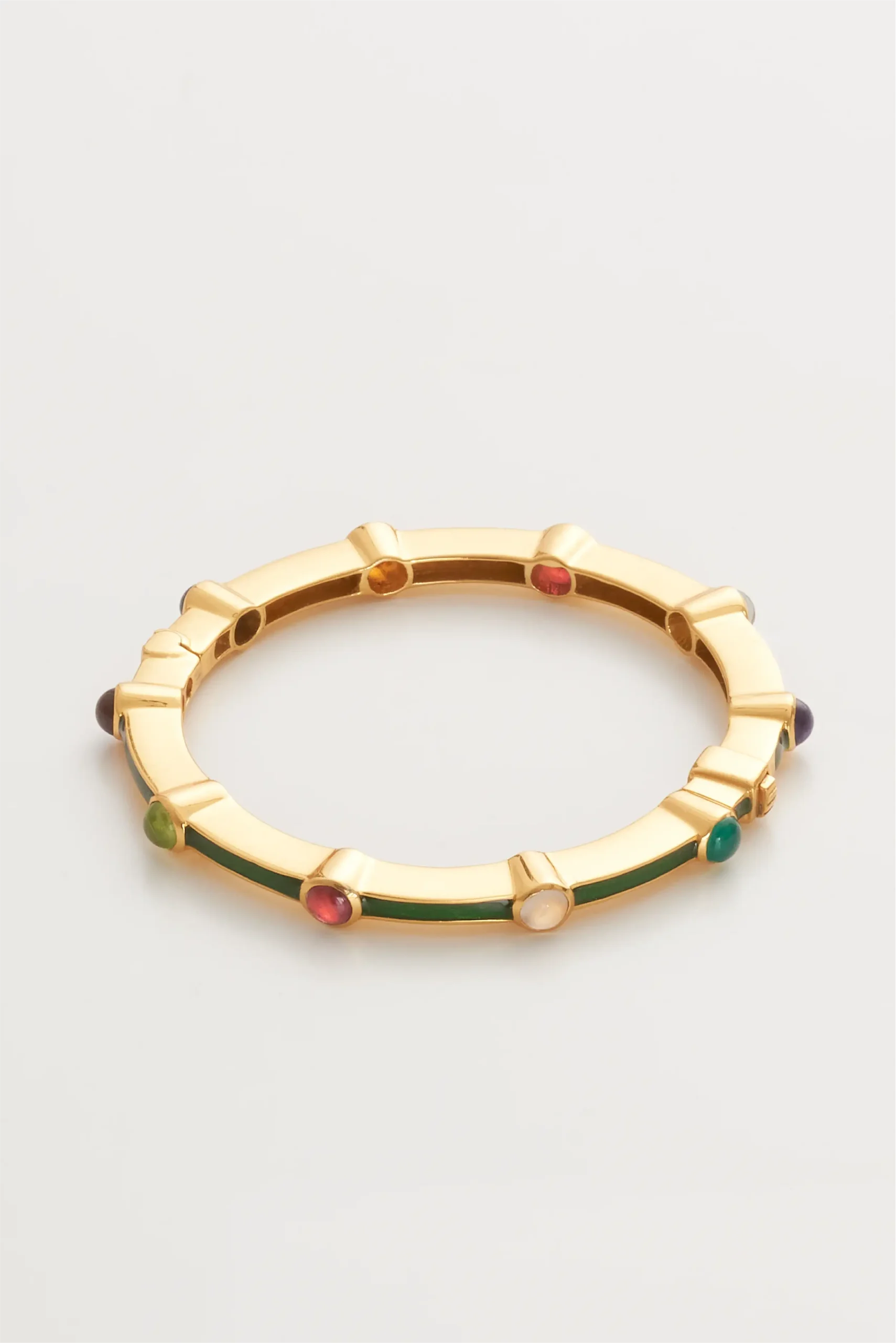 925 ayar gümüş üzerine 22 ayar 3 mikron altın kaplama, mine (enamel) ve özenle seçilmiş doğal taşlarla üretilmiştir.