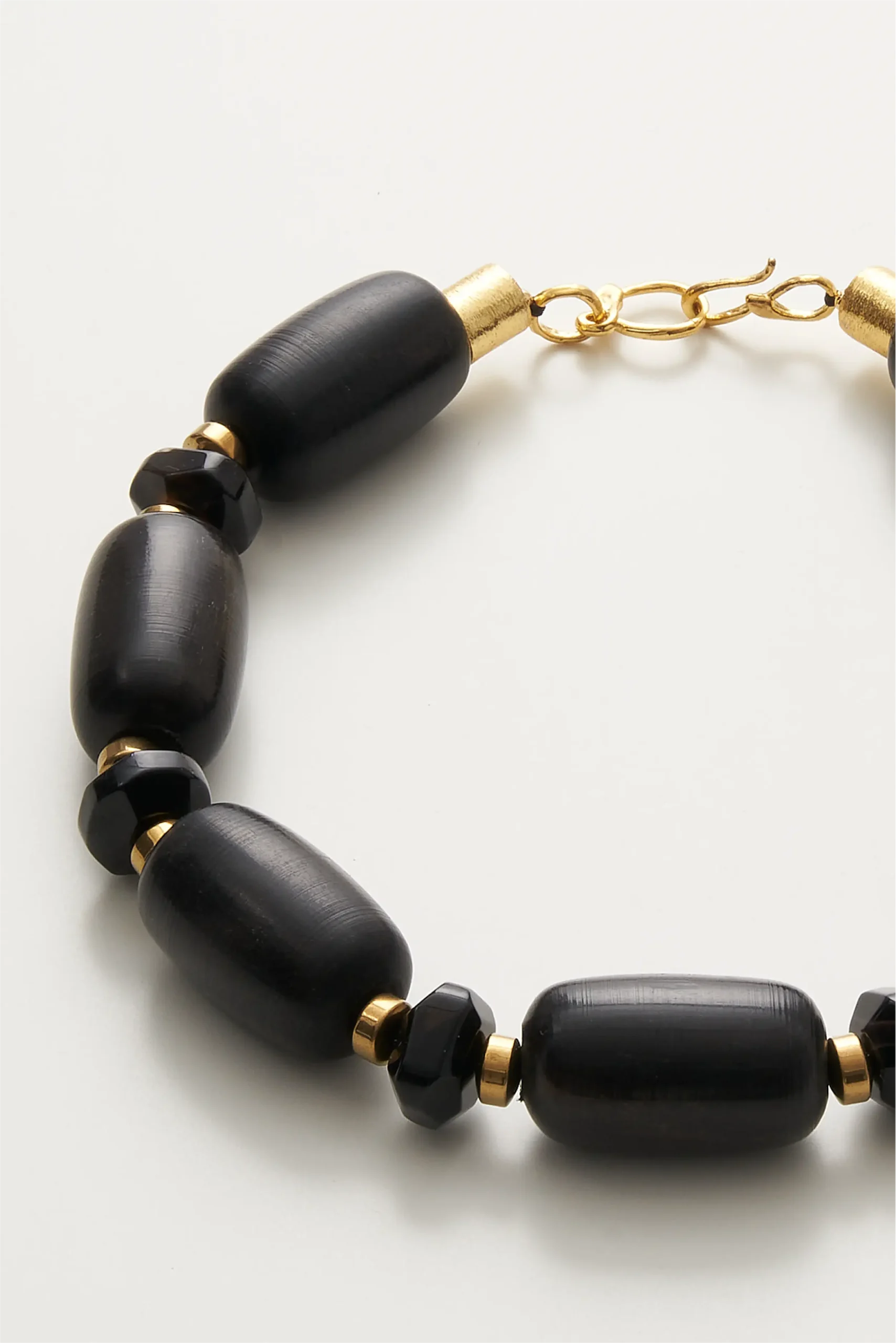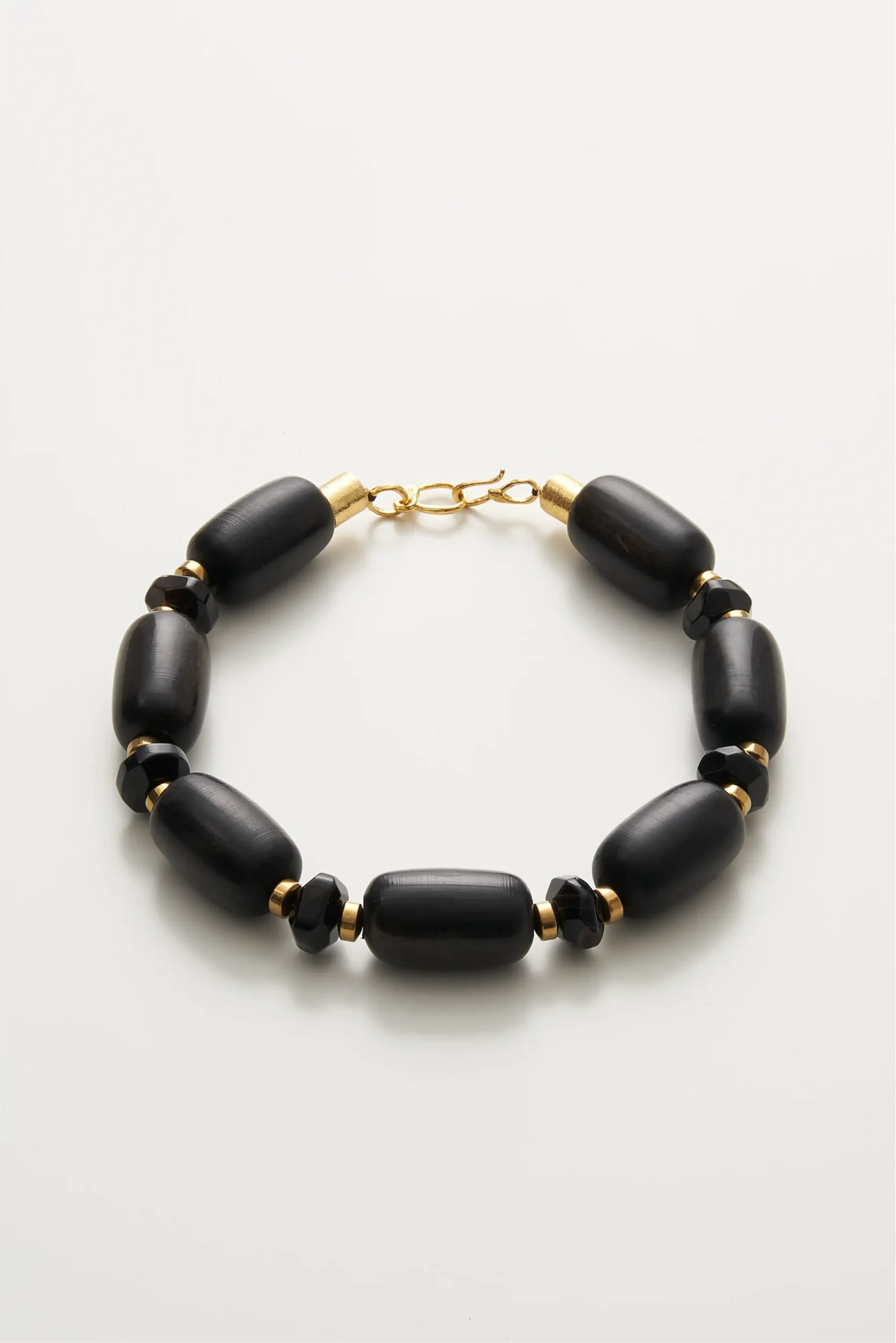 Agat ve ahşap boncuktan üretilmiştir. Klips ve diğer materyaller, bronz üzerine altın kaplamadır.