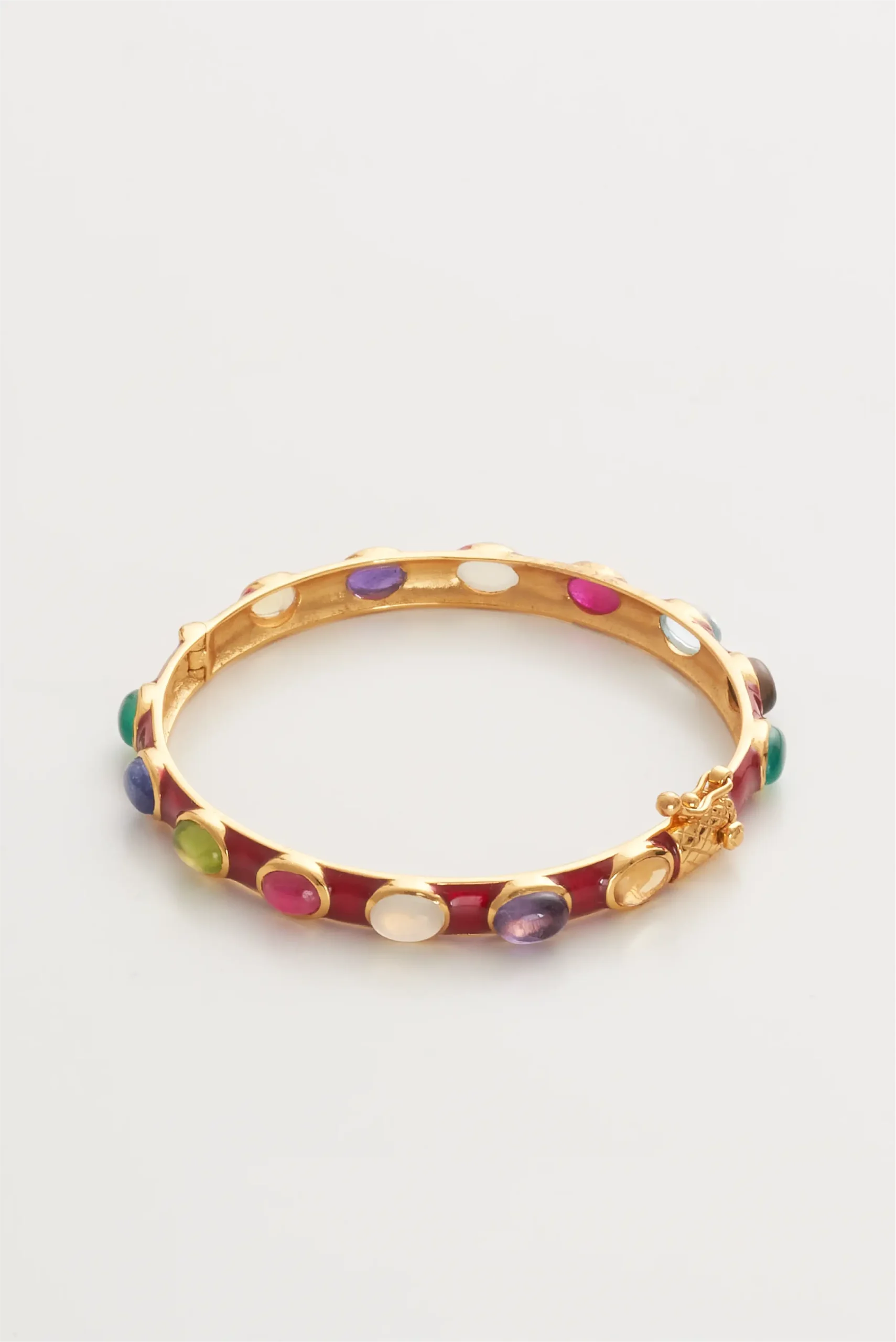 925 ayar gümüş üzerine 22 ayar 3 mikron altın kaplama, mine (enamel) ve özenle seçilmiş doğal taşlarla üretilmiştir.